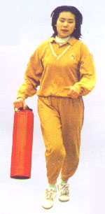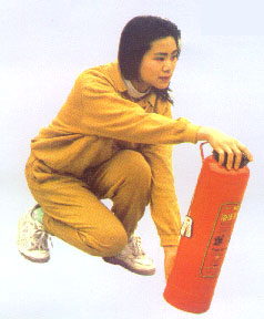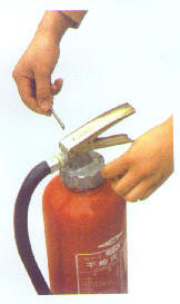 1、右手握着压把,左手托着灭火器底部,轻轻取下灭火器