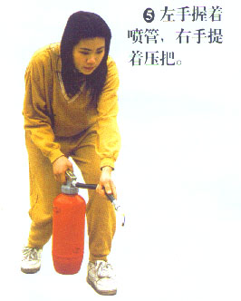 5、站在距火源两米的地方,左手拿着喇叭筒,右手用力压下压把